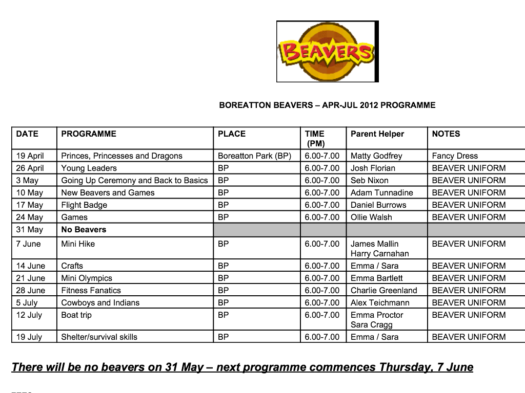 The beavers will need to wear their beaver jumpers as they have to have long sleeves on. We are starting at 6pm so be there for 5:50pm We expect to finish at 7:30(ish)